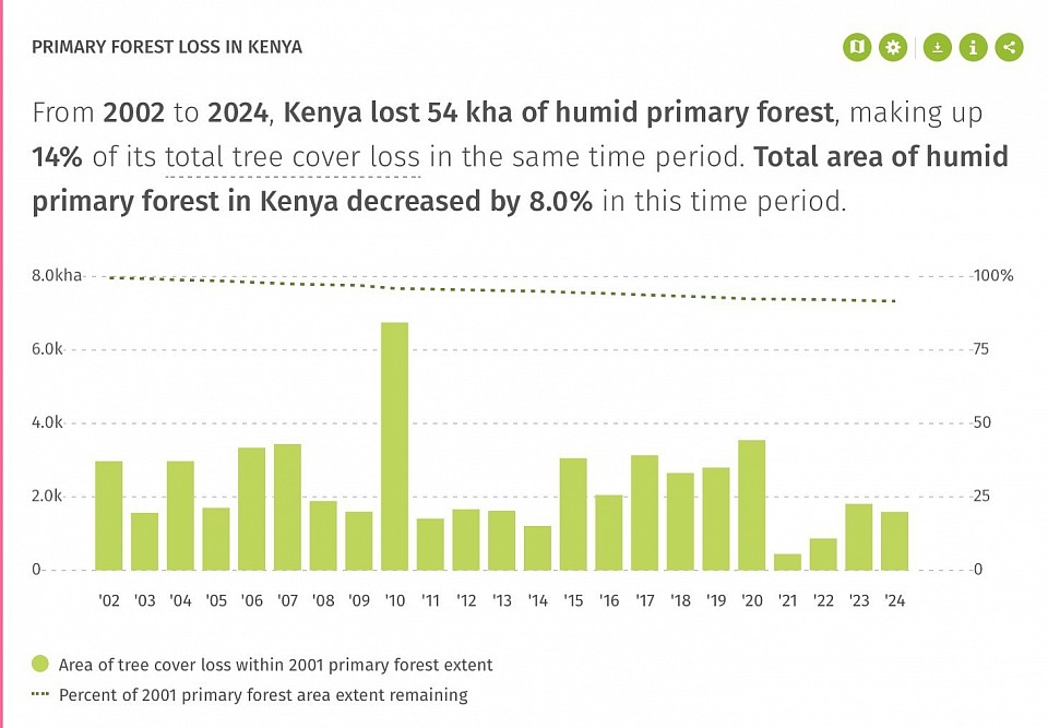 Urbanisation, roads, railways and other infrastructure fragment wildlife habitats and block migration corridors, increasing human–wildlife conflict. Deforestation (graph) for timber, charcoal production and farming have reduced forest cover in key water catchment areas, thus degrading ecosystem services (11). In rangelands, land subdivision and fencing block traditional wildlife movement routes, especially in areas like the Maasai Mara (10). Wetland drainage and overuse of water resources further degrade aquatic habitats. Together, these factors reduce habitat connectivity and threaten Kenya’s biodiversity.